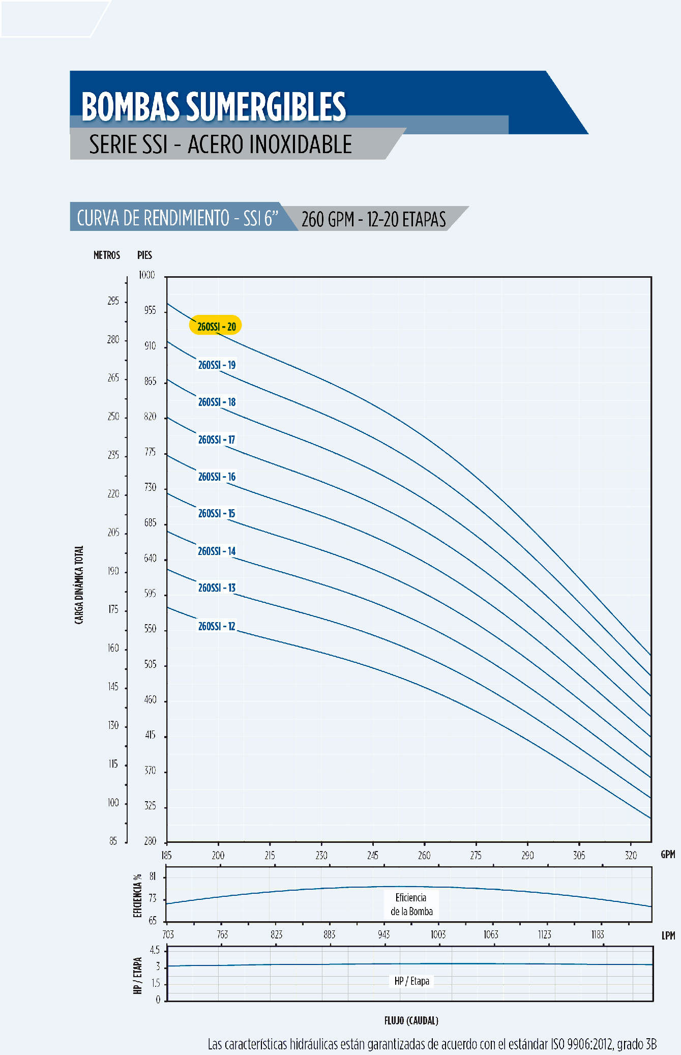 Cuerpo de bomba (sin motor) para pozo QNom:260GPM 60HP 260SSI60F66-2064, Hest:195m DiaExt:6″ DiamDesc:4″ plg, Etapas: 20, Serie SSI – 6″ Qmax:308GPM Qmin: 220GPM 68HPmax, Hmax: 271m Hmin:178m, para acoplar a motor de 6″PLG, marca Franklin Electric Serie SSI – 6″