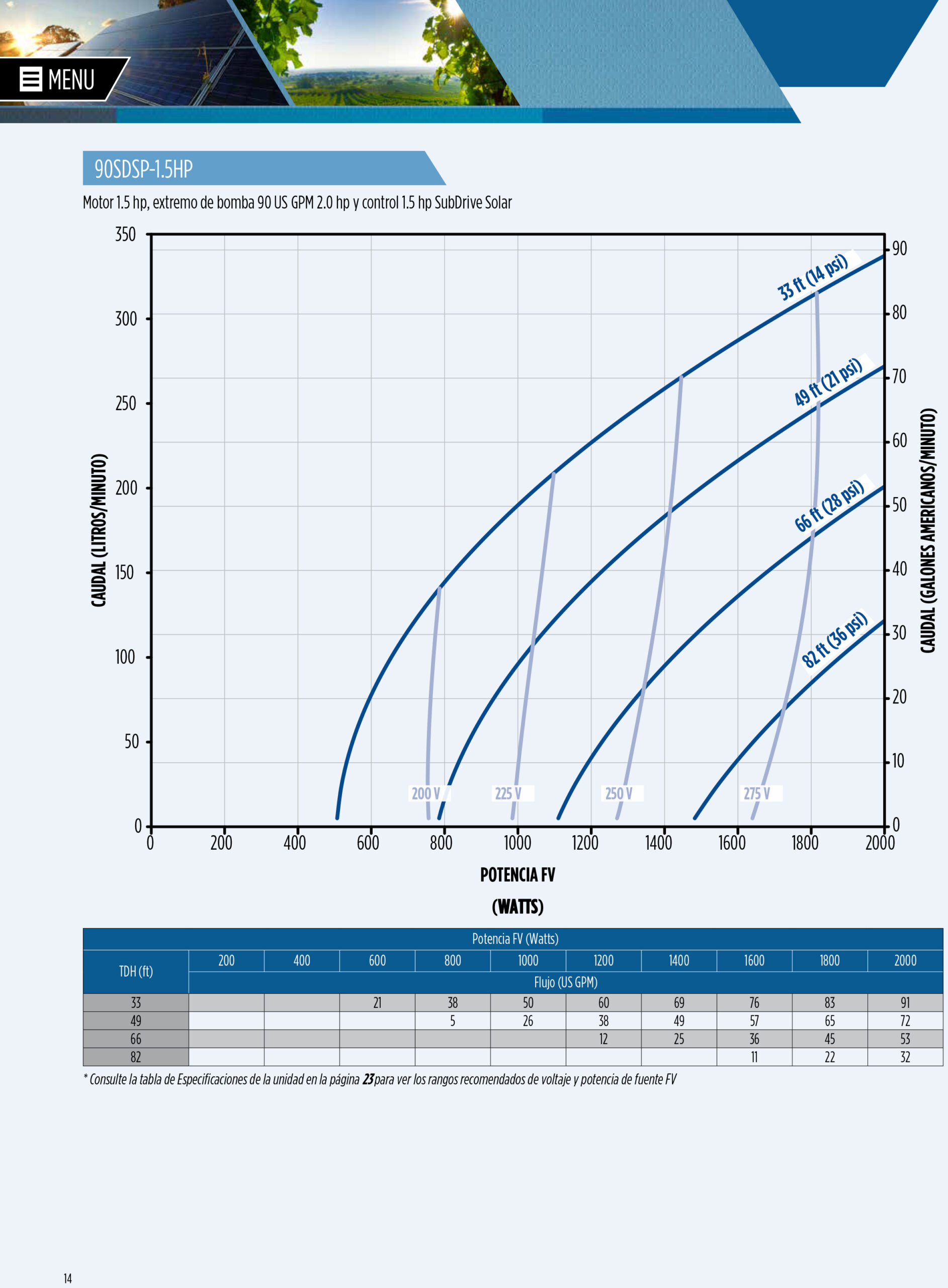 El SubDrive SolarPAK es un sistema de bombeo solar robusto que integra la capacidad de operar en sistemas de alimentación con corriente alterna o corriente directa sin accesorios adicionales. Cubre un rango de 0.75 a 3 HP y 5 a 90 GPM con una carga maxima de 265 metros (869 pies).