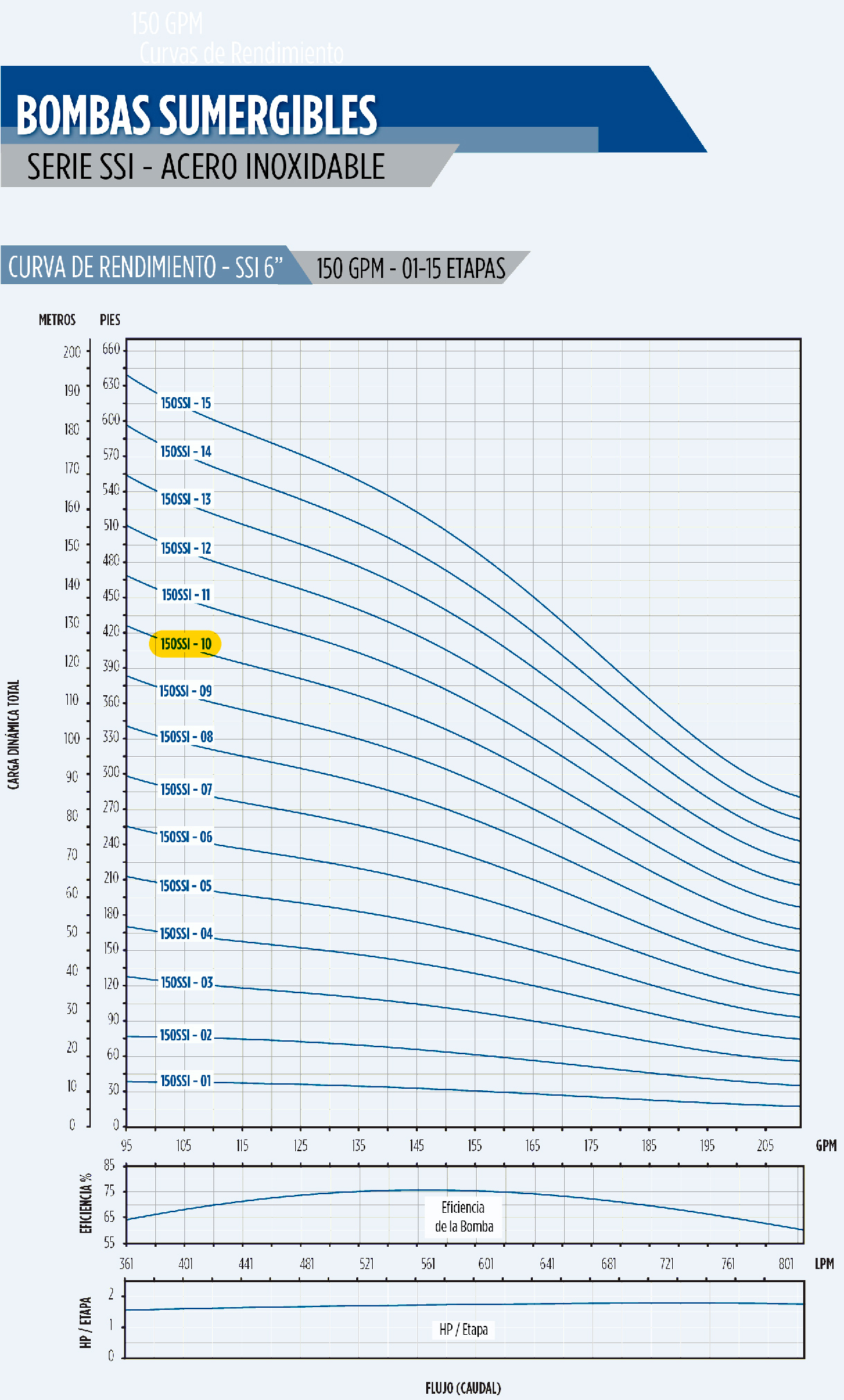 Cuerpo de bomba (sin motor) para pozo QNom:150GPM 20HP 150SSI20F66-1063, Hest:113m DiaExt:6″ DiamDesc:3″ plg, Etapas: 10, Serie SSI – 6″ Qmax:185GPM Qmin: 106GPM 18HPmax, Hmax: 123m Hmin:75m, para acoplar a motor de 6″PLG, marca Franklin Electric Serie SSI – 6″