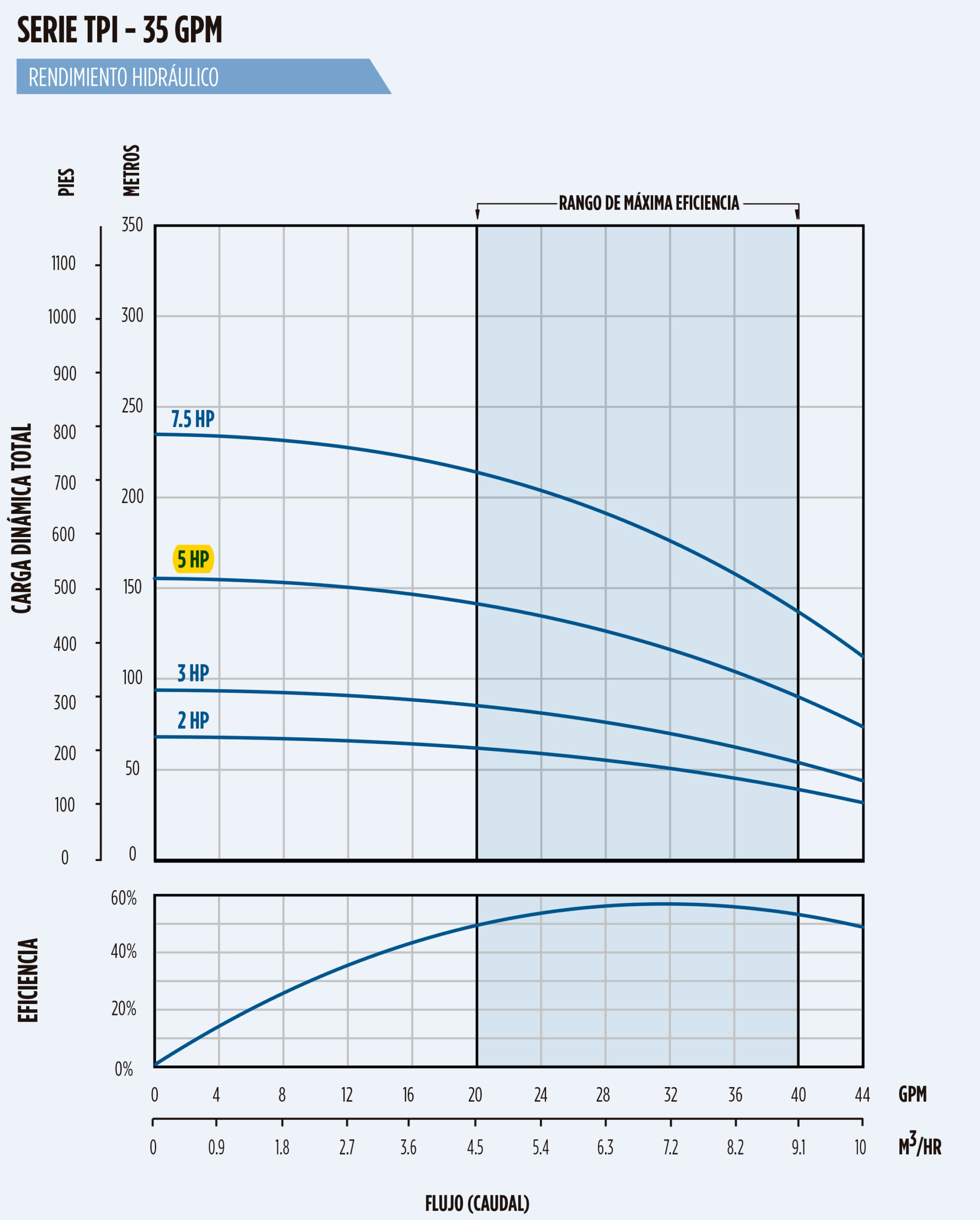 Rendimientos de 35, 45, 60 y 90 GPM para aplicaciones con diametros de 4″