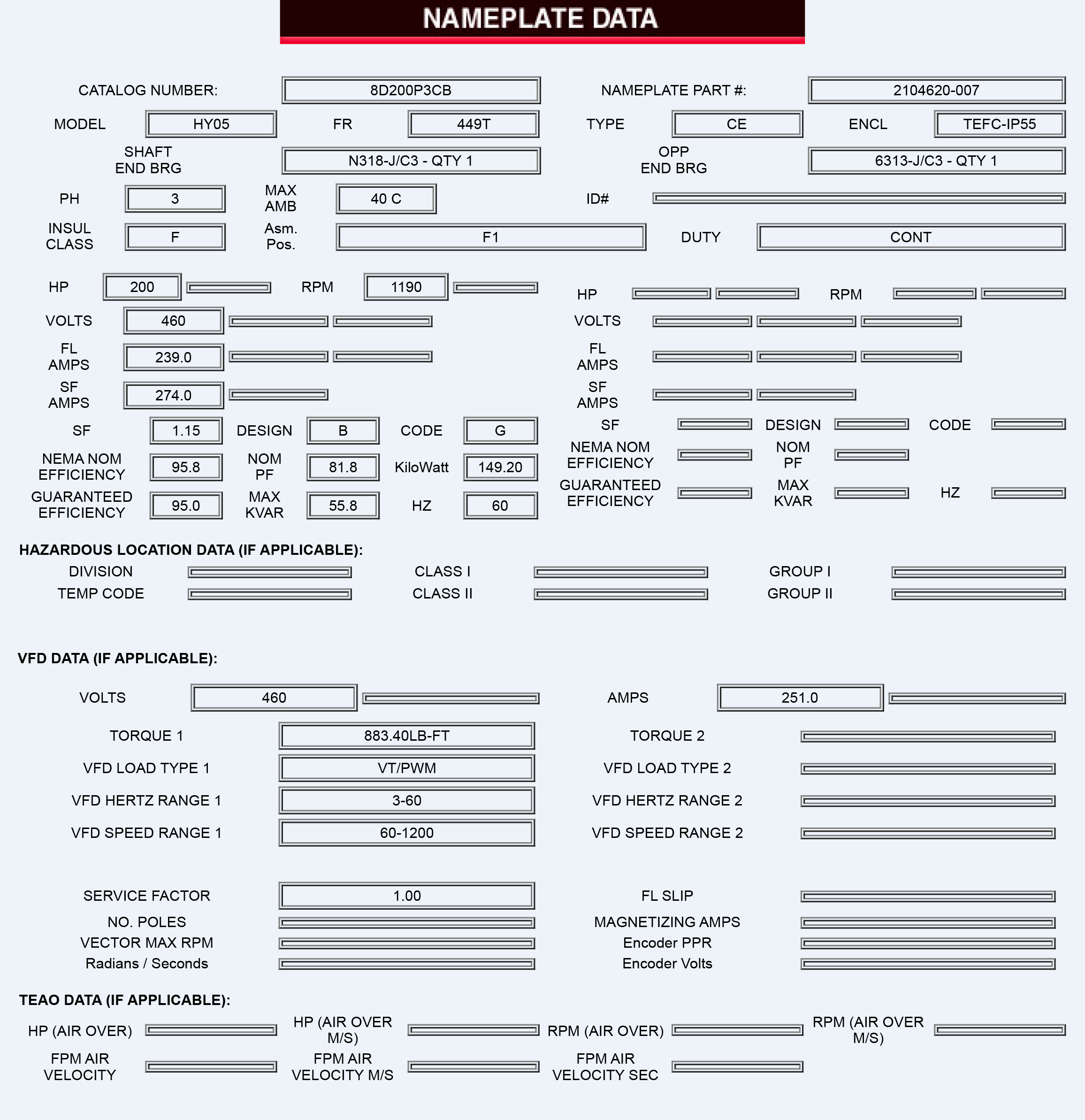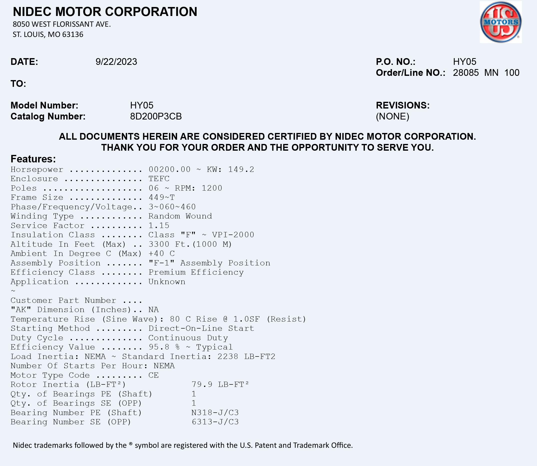Motor de 200HP 1200RPM 6P 404T TEFC IP65 460V marca US Motors NEMA FCA-Miami PDF1