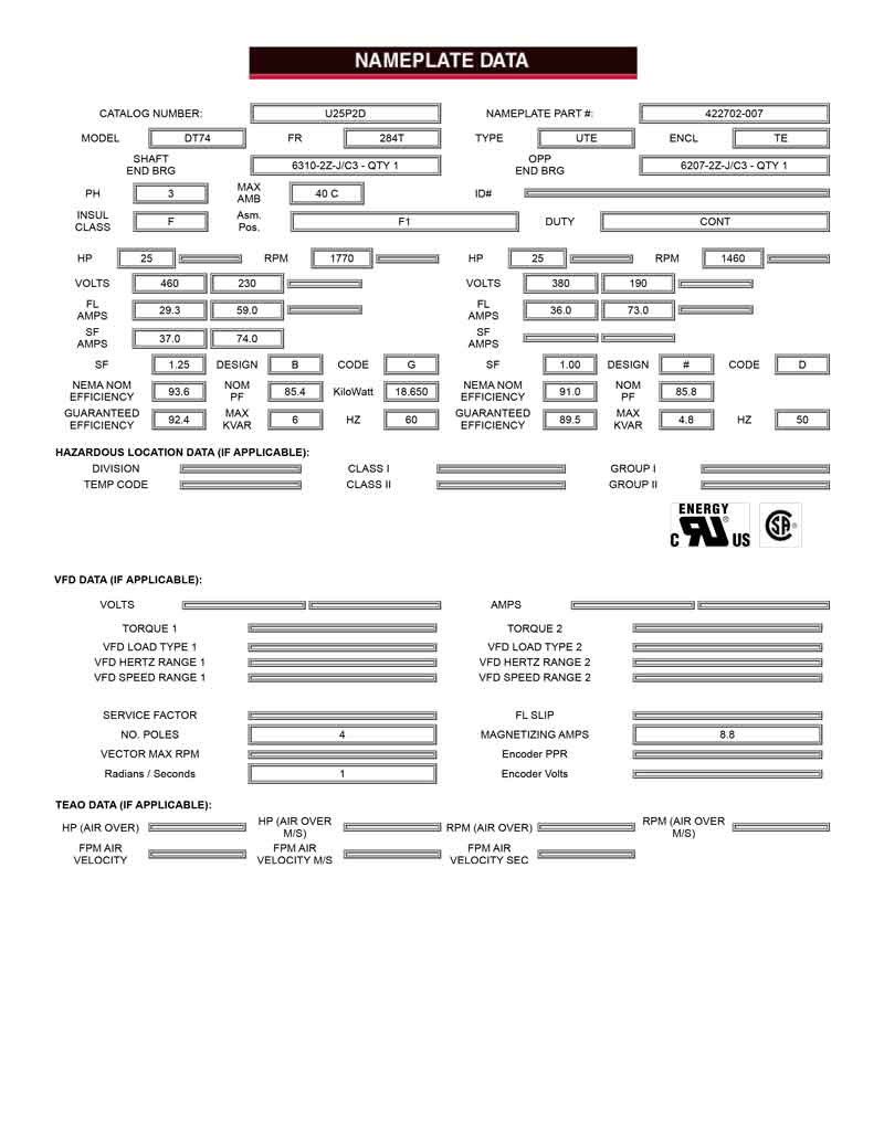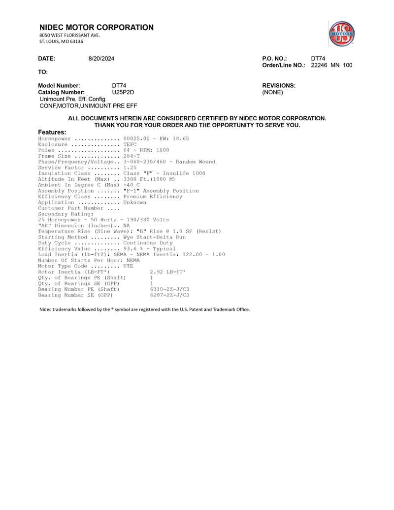 Motor horizontal 25HP 1800rpm TEFC Frame 284-T 230/460V Modelo DT74 PDF1PDF2
