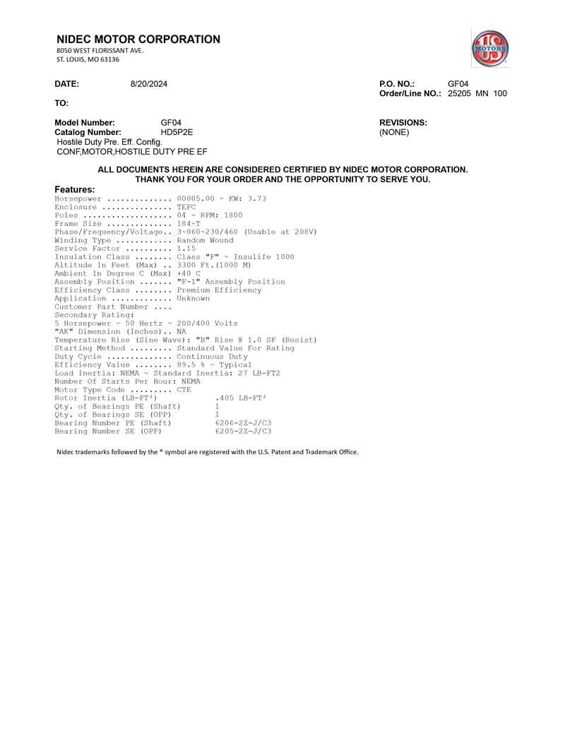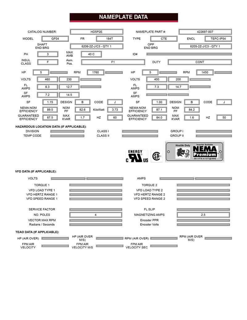 Motor horizontal 5HP 1760rpm 230/460v 4p frame 184Tmodelo GF04 TEFC proposito general Catalogo HD5P2E PDF1PDF2