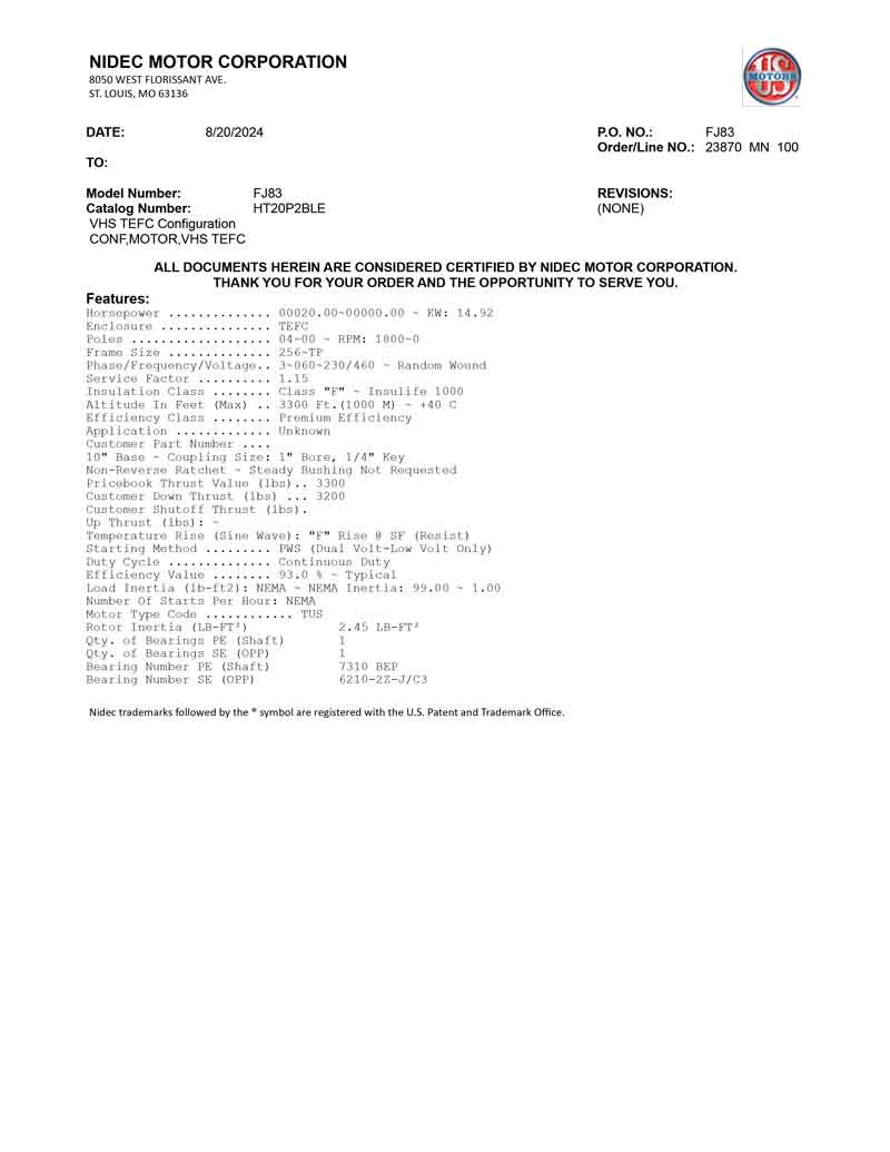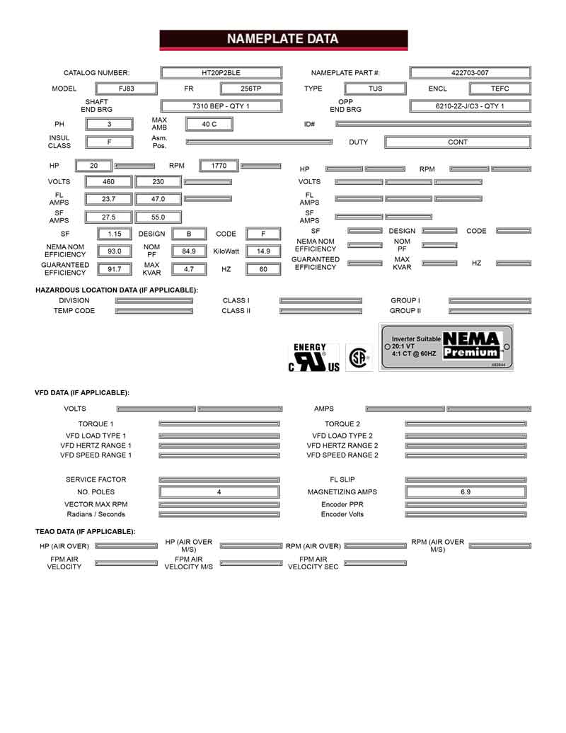 Motor Vertical eje hueco 20HP 1770rpm TEFC 230/460v HT20P2BLE -Catalog #: HT20P2BLE Model #: FJ83 Los Motores Verticales Flecha Hueca NEMA Premium son recoNocidos estandares en la industria del bombeo desde 1922, destacando por su alta confiabilidad. Su reputación se respalda con una larga trayectoria, brindando constante confiabilidad y facilidad de manejo a los clientes. Estos motores, con configuración única para adaptarse a requisitos especificos, estan construidos con materiales de alta calidad bajo la Norma ISO 9000-2000. Su constante inNovación, rendimiento y diseño los han convertido en los motores mas confiables de la industria.
