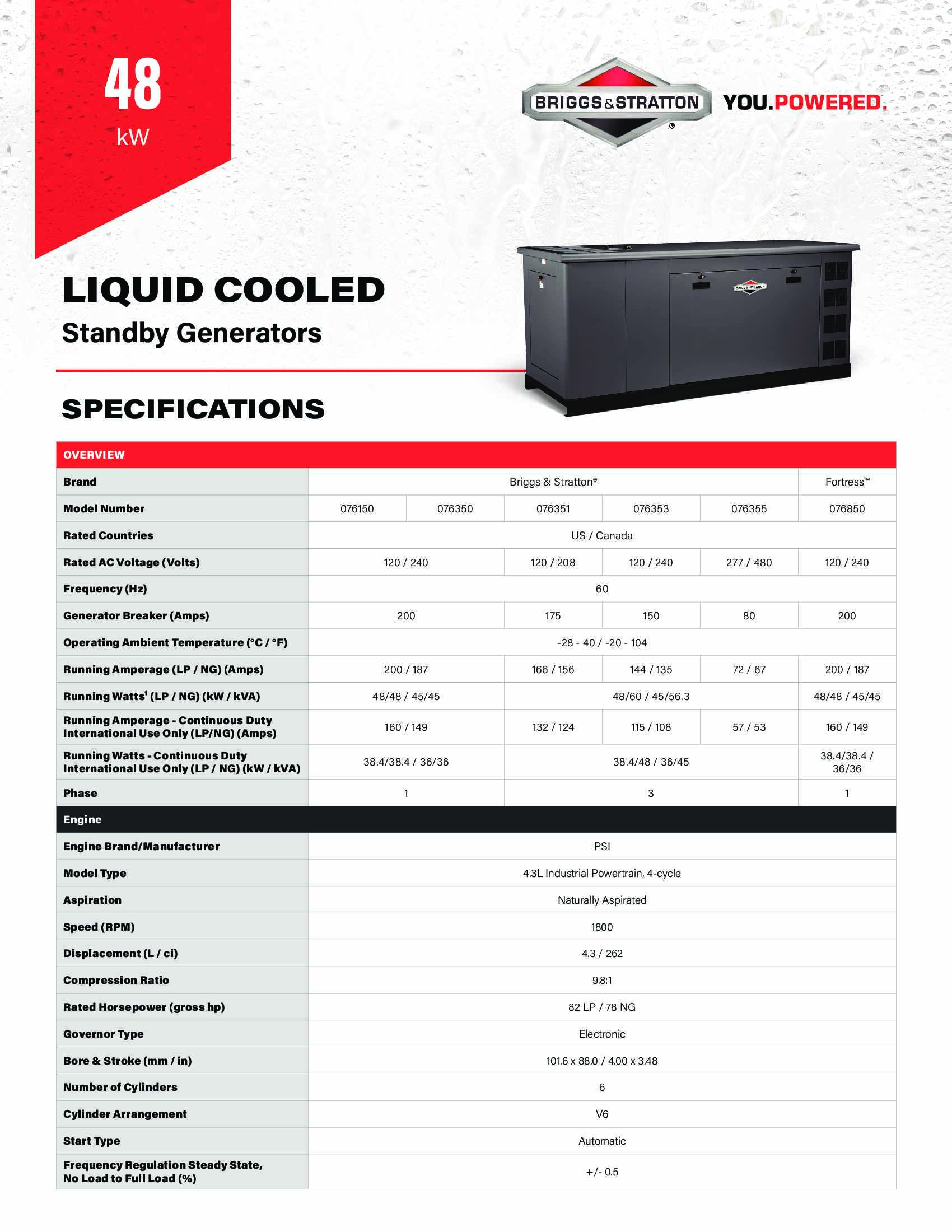 PLANTA A GAS 48KW BRIGGS 076150-03 Planta a gas natural de 48KW MoNofasico Marca: BRIGGS & STRATTON, Americano, Modelo: 076150-03