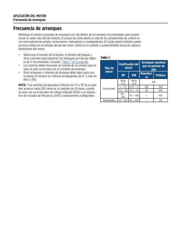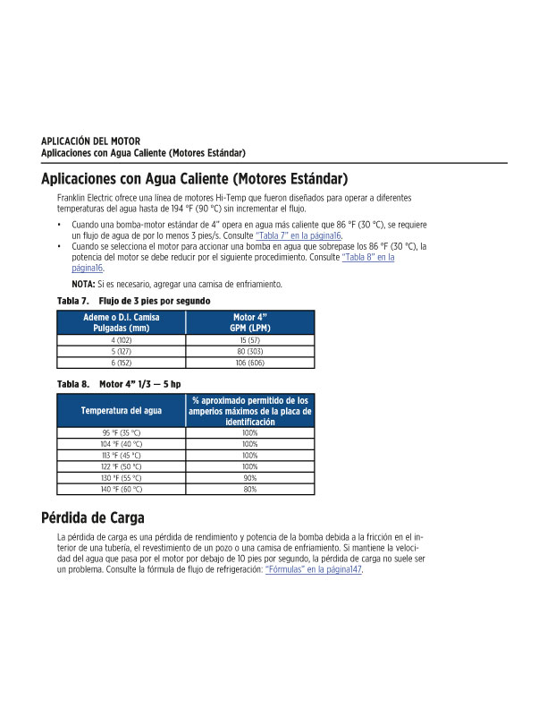 Se requiere un flujo mínimo de 0.25 pies por segundo para un motor de 4” de 3 HP y mayores.