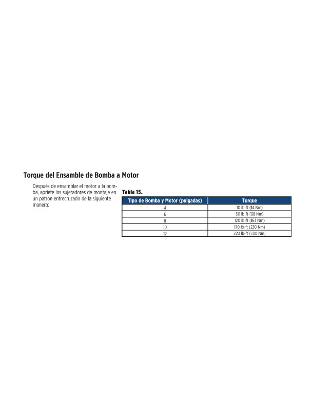 El torque de apriete recomendado para una bomba y motor de 4 pulgadas es de 10 lb-ft (14 Nm).